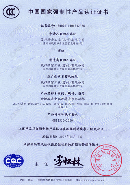 CCC電容運(yùn)轉(zhuǎn)減速機(jī)證書